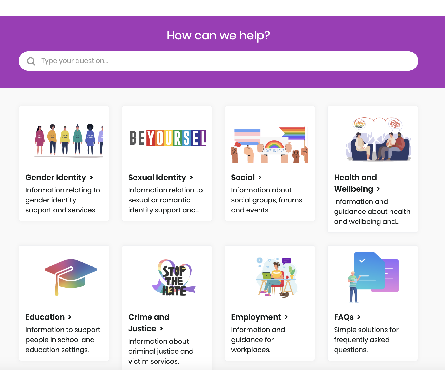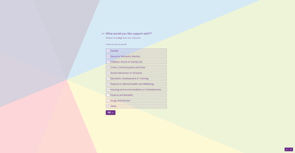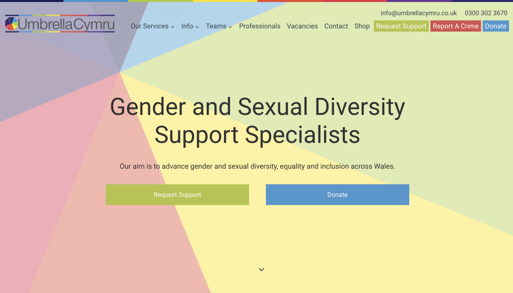Umbrella Cymru is a gender and sexual diversity support service. We offer support and services to people of any age, anywhere in Wales. Our aim is to improve the lives of LGBTQ+ people in Wales through tailored individual or family support.